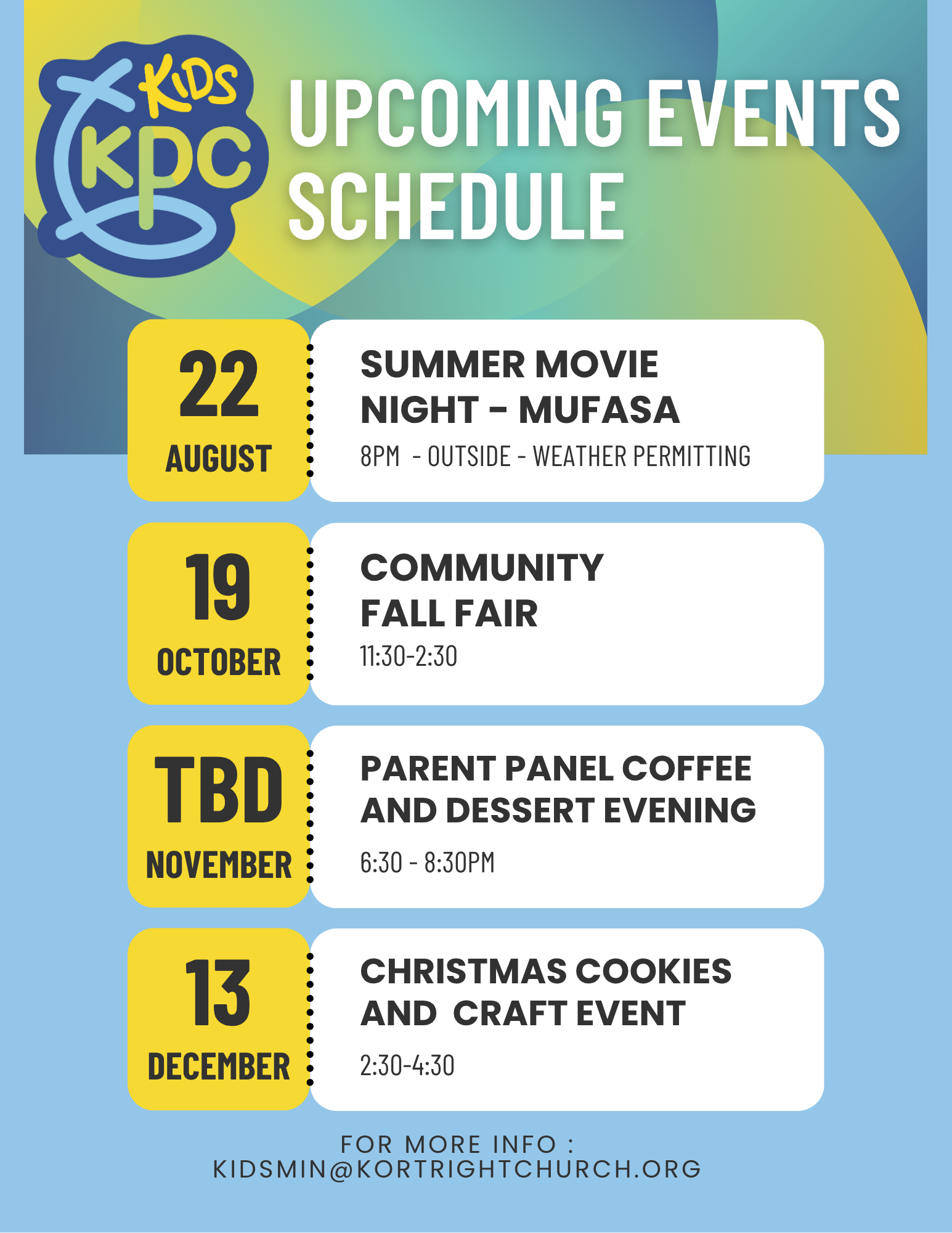 For more information about our Children’s Ministries, please email Elene at kidsmin@kortrightchurch.org
